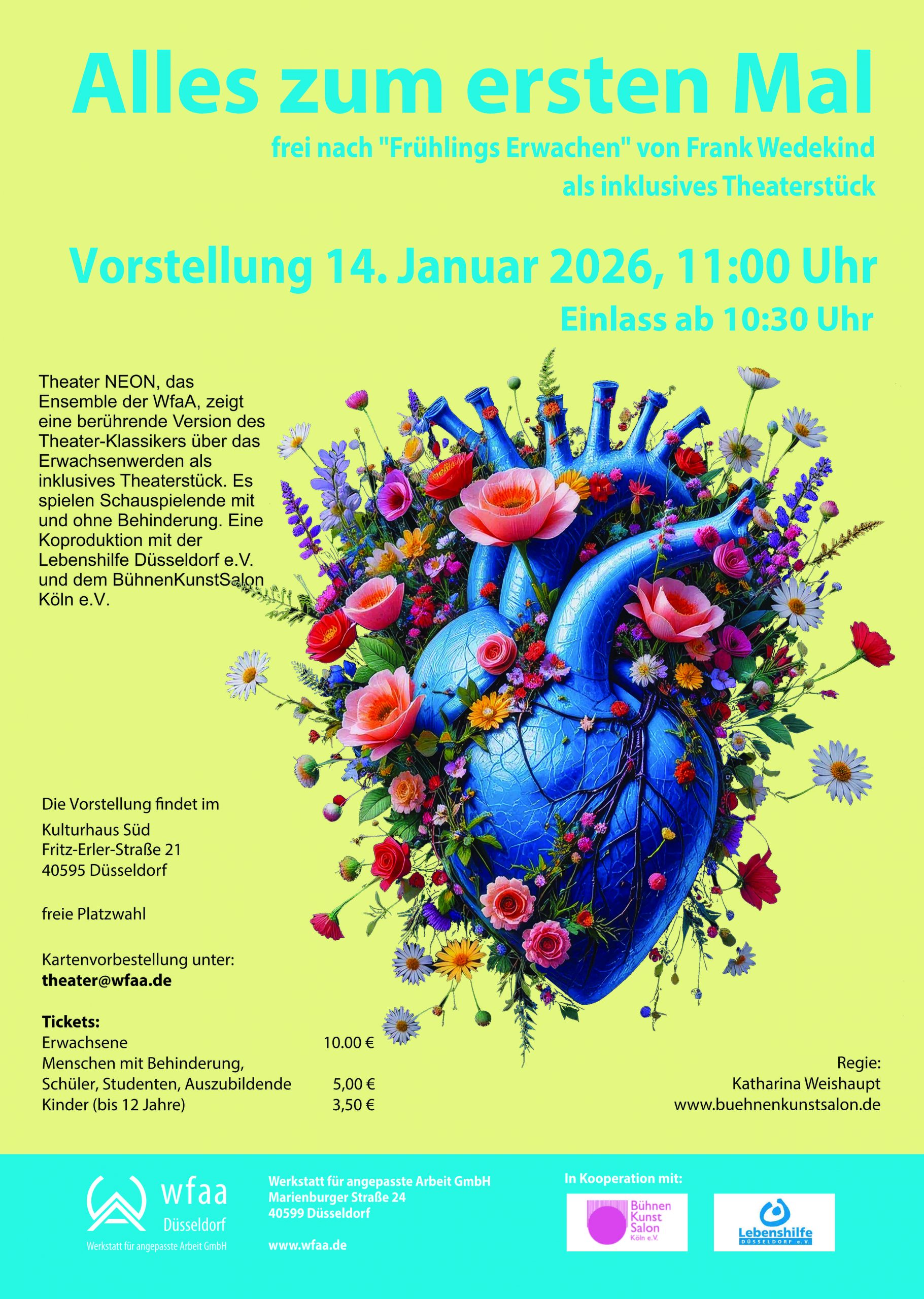 ALLES ZUM ERSTEN MAL frei nach "Frühlings Erwachen" von Frank Wedeking als inklusives Theaterstück Matineevorstellung am 14. Januar 2026 um 11.00 Uhr Einlass ab 10.30 Uhr Kartenvorbestellung an: theater@wfaa.de THEATER […]